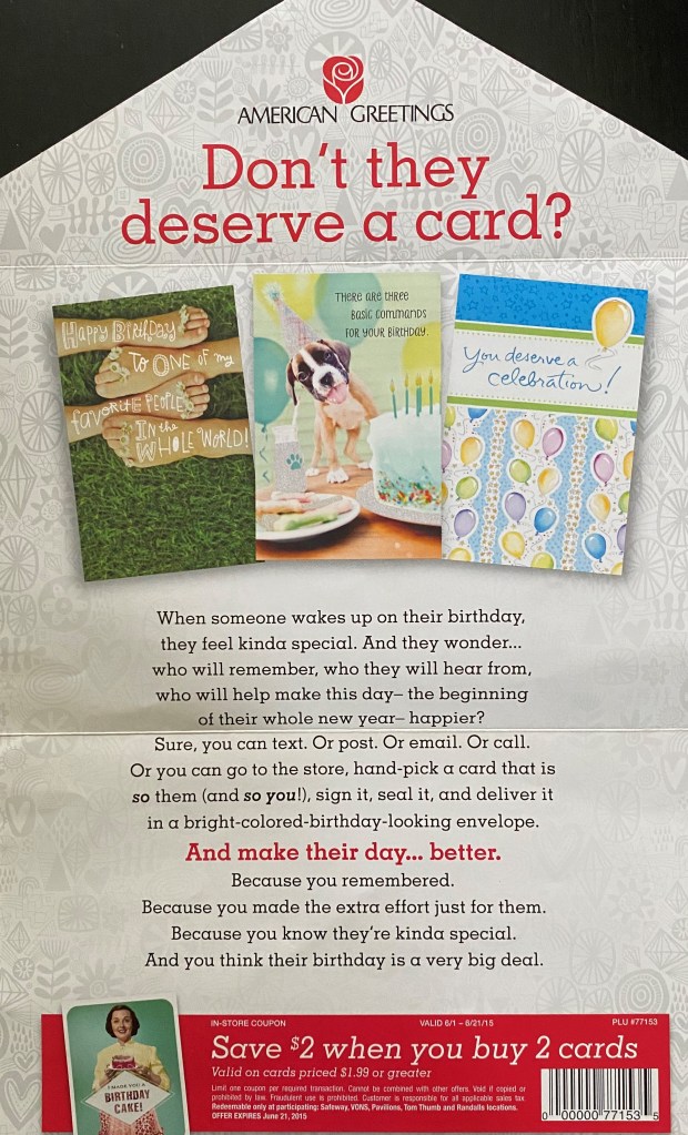 Sure, you can text. Or post. Or email. Or call. Or you can go to the store, hand-pick a card that is so them (and so you!), sign it, seal it, and deliver it in a bright-colored-birthday-looking-envelope.